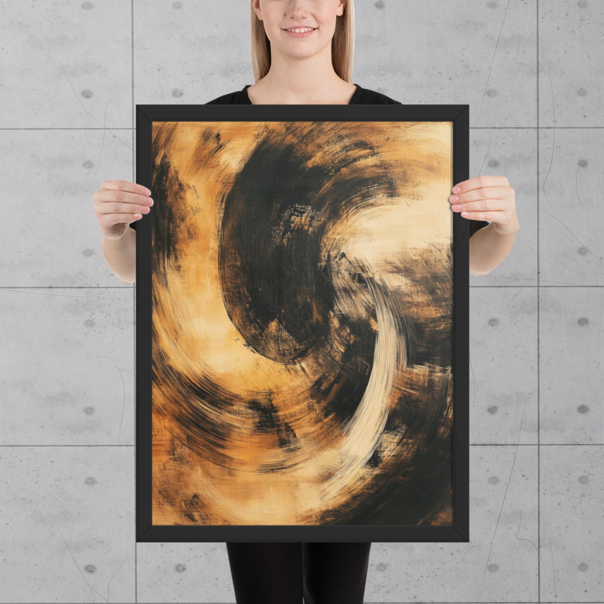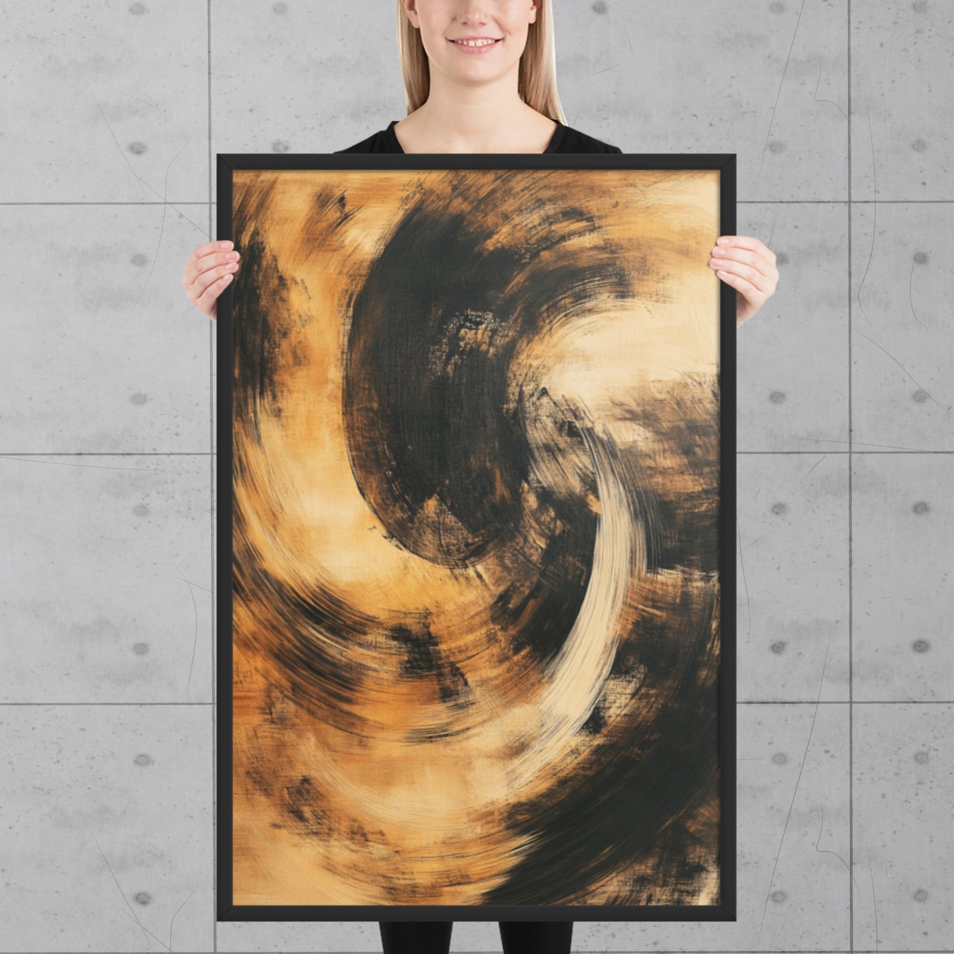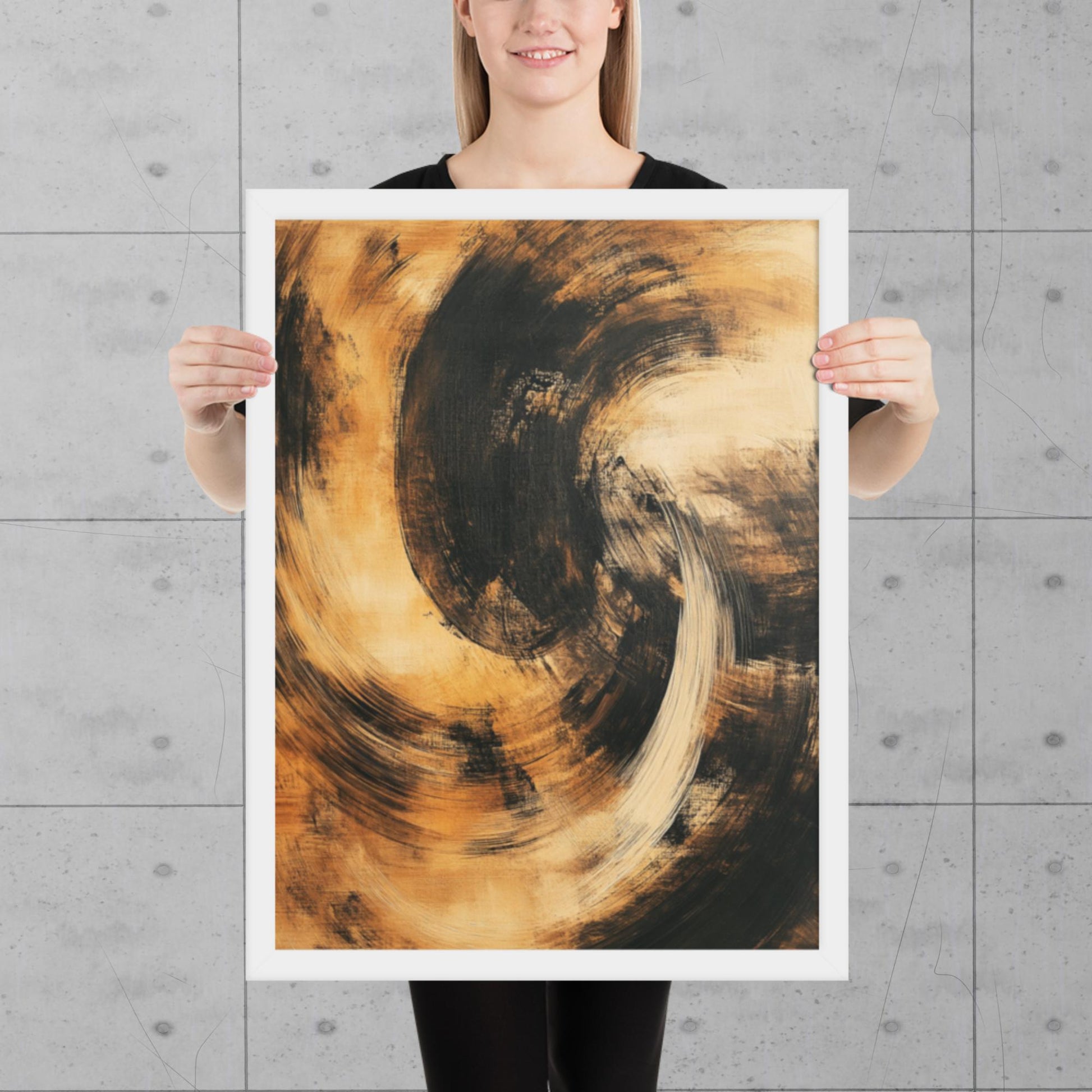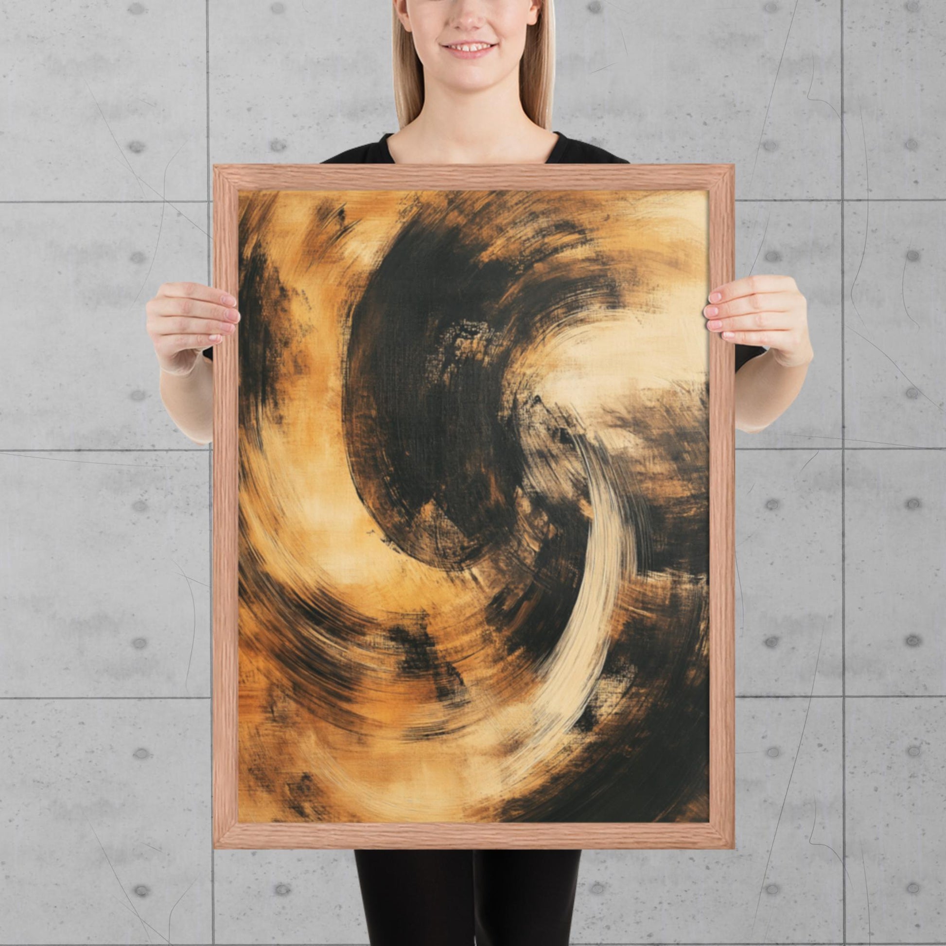 A whirlwind of energy and warmth unfolds in this abstract work that pays homage to the ritual of coffee. Intense shades of espresso brown, toasted beige, and charcoal black blend in a circular dance that evokes the aroma, movement, and texture of freshly brewed coffee.