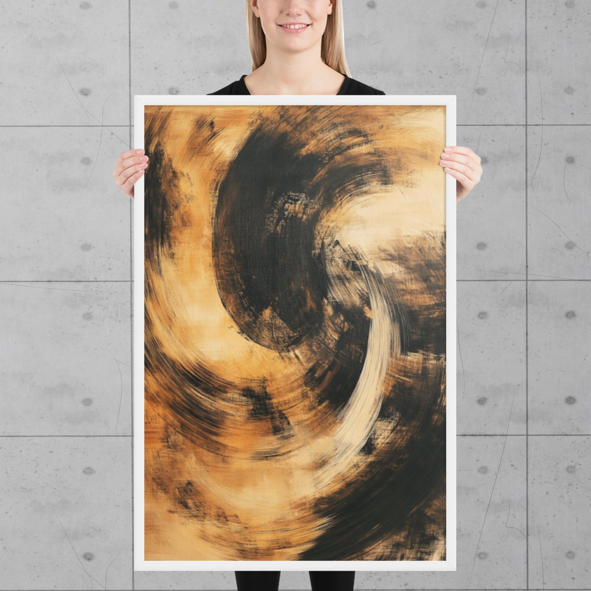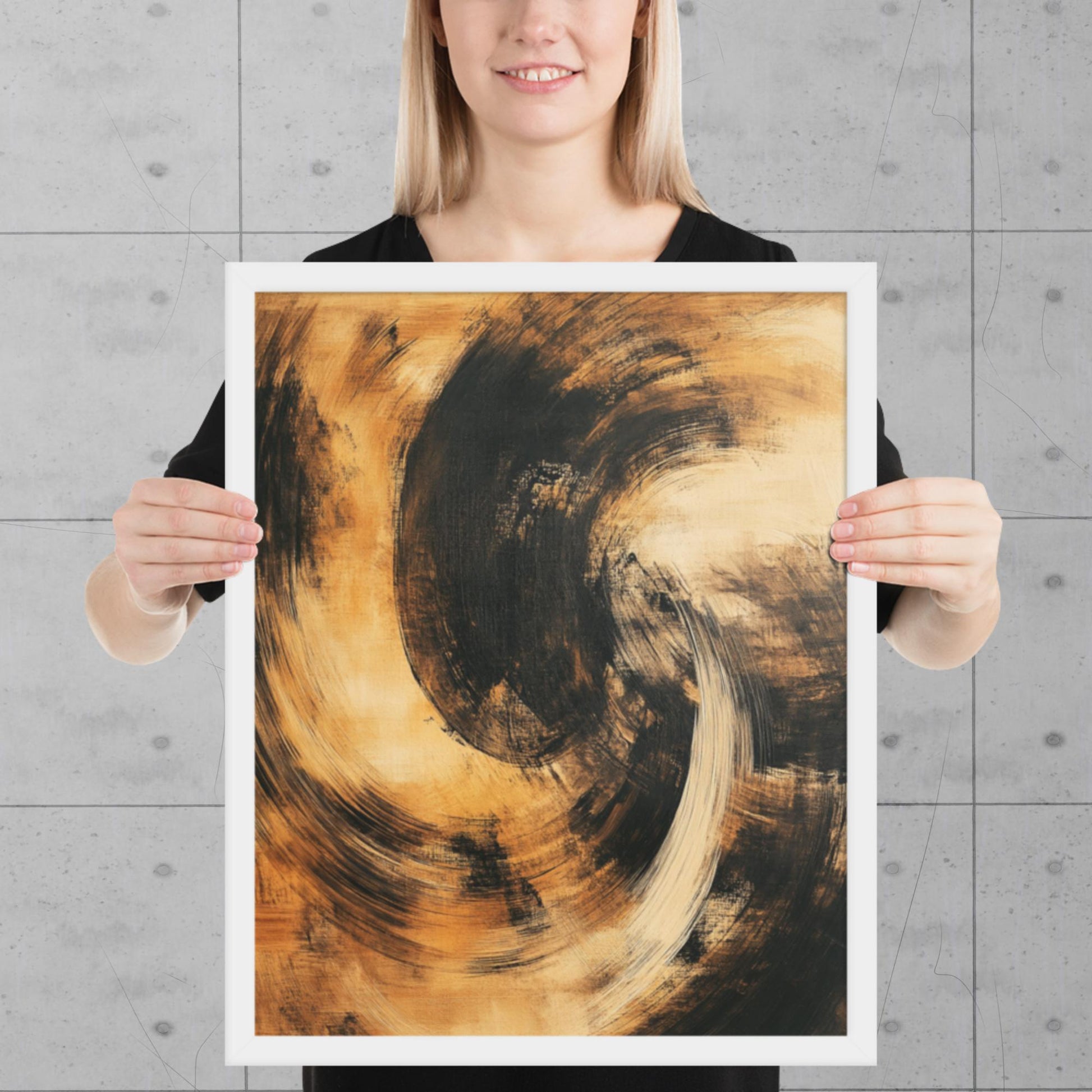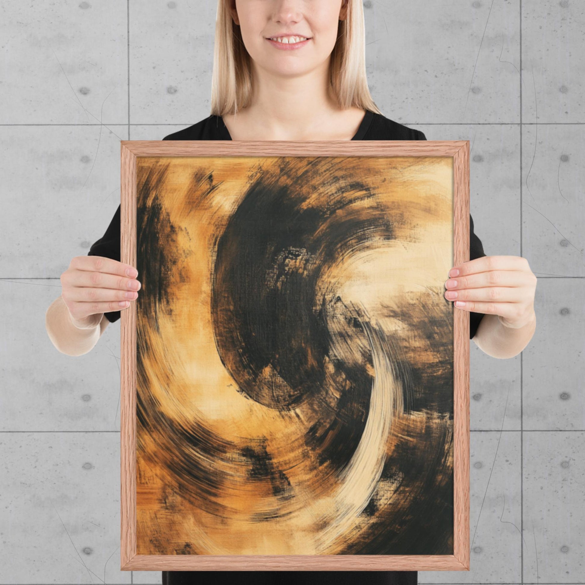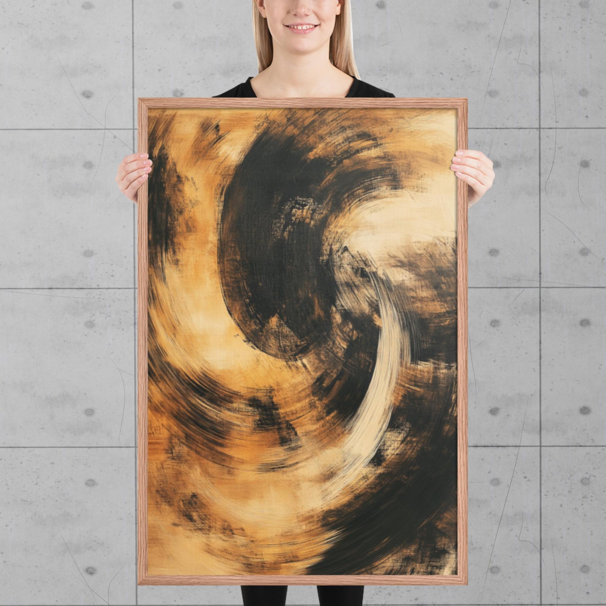 A whirlwind of energy and warmth unfolds in this abstract work that pays homage to the ritual of coffee. Intense shades of espresso brown, toasted beige, and charcoal black blend in a circular dance that evokes the aroma, movement, and texture of freshly brewed coffee.