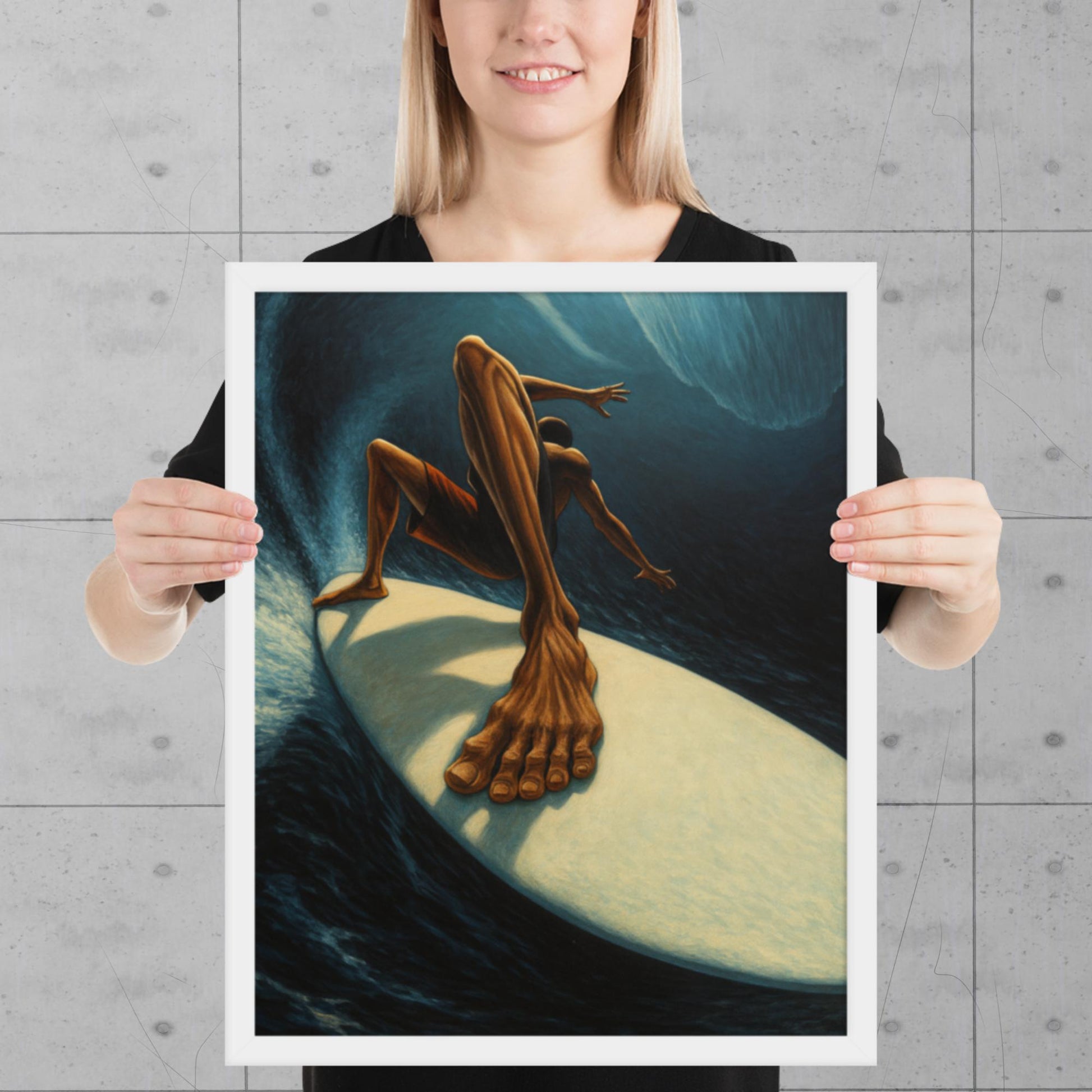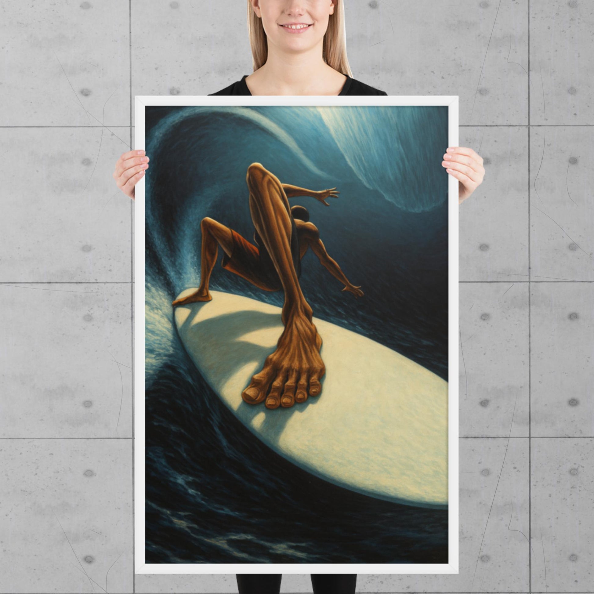 This painting captures the raw energy of surfing from an extreme perspective, where movement, light, and tension combine to create a powerful and immersive scene. The figure appears artistically distorted, accentuating the strength, balance, and adrenaline of the moment.