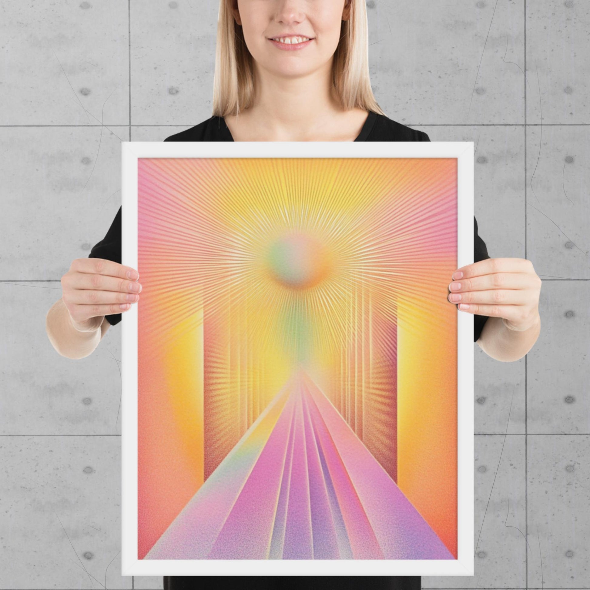 Ascending lines in pastel hues. Lavender, coral, and gold guide the eye toward a central sun that radiates serene and transcendental energy. With a vibrant palette and a celestial design, this abstract geometric composition conveys balance, expansion, and hope. Ideal for modern environments seeking a spiritual and contemporary touch.