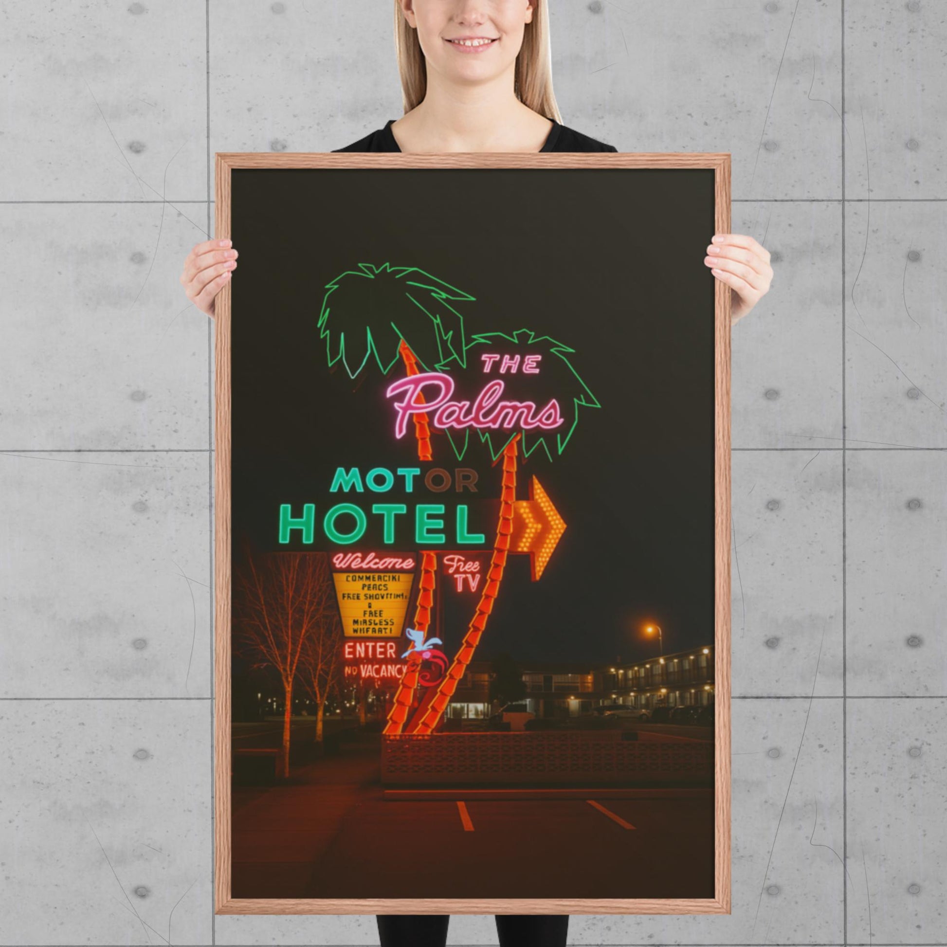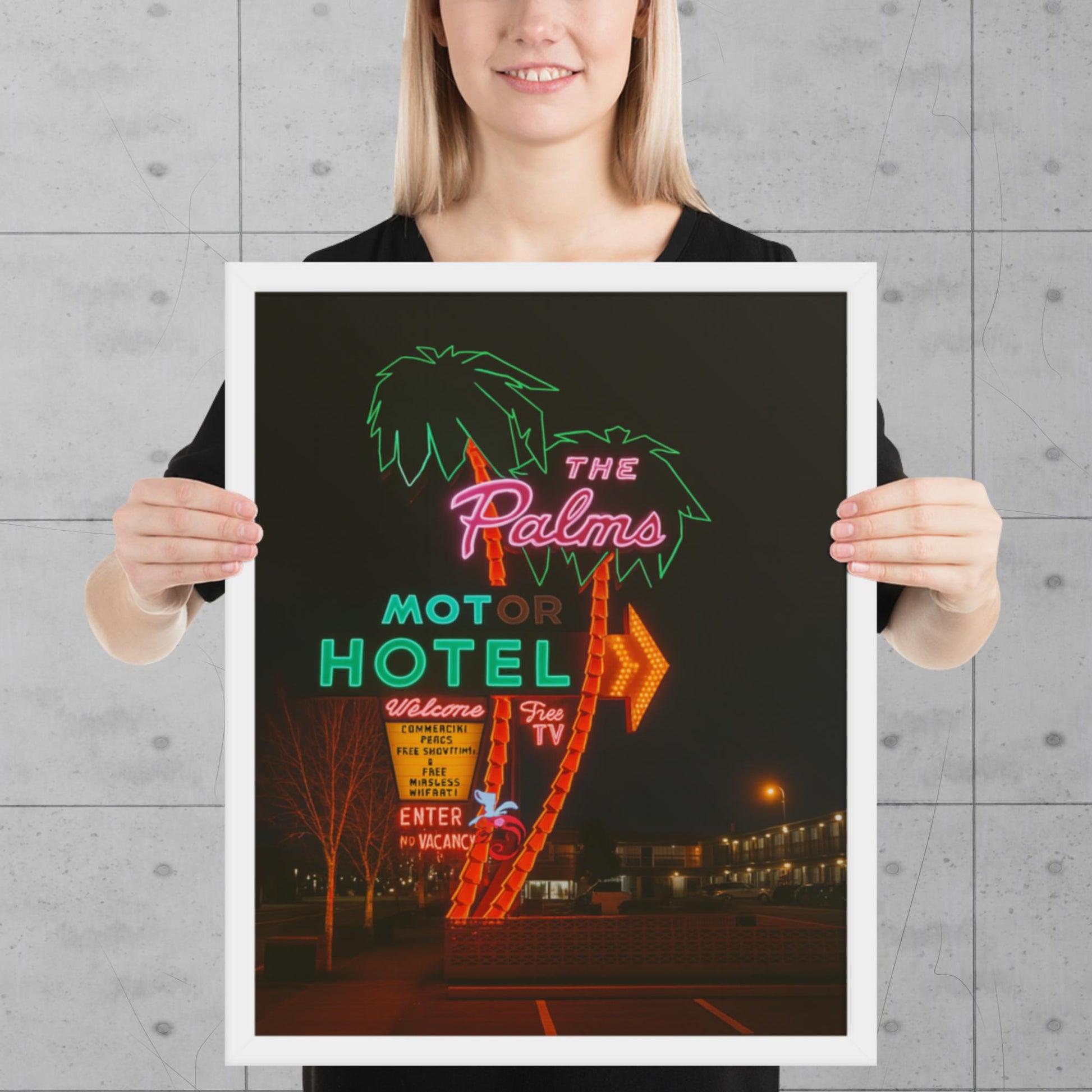 A nighttime scene imbued with a retro atmosphere, where the illuminated sign of a classic motel glows with vibrant shades of pink, green, and yellow. The composition conveys a perfect blend of nostalgia and vintage charm.