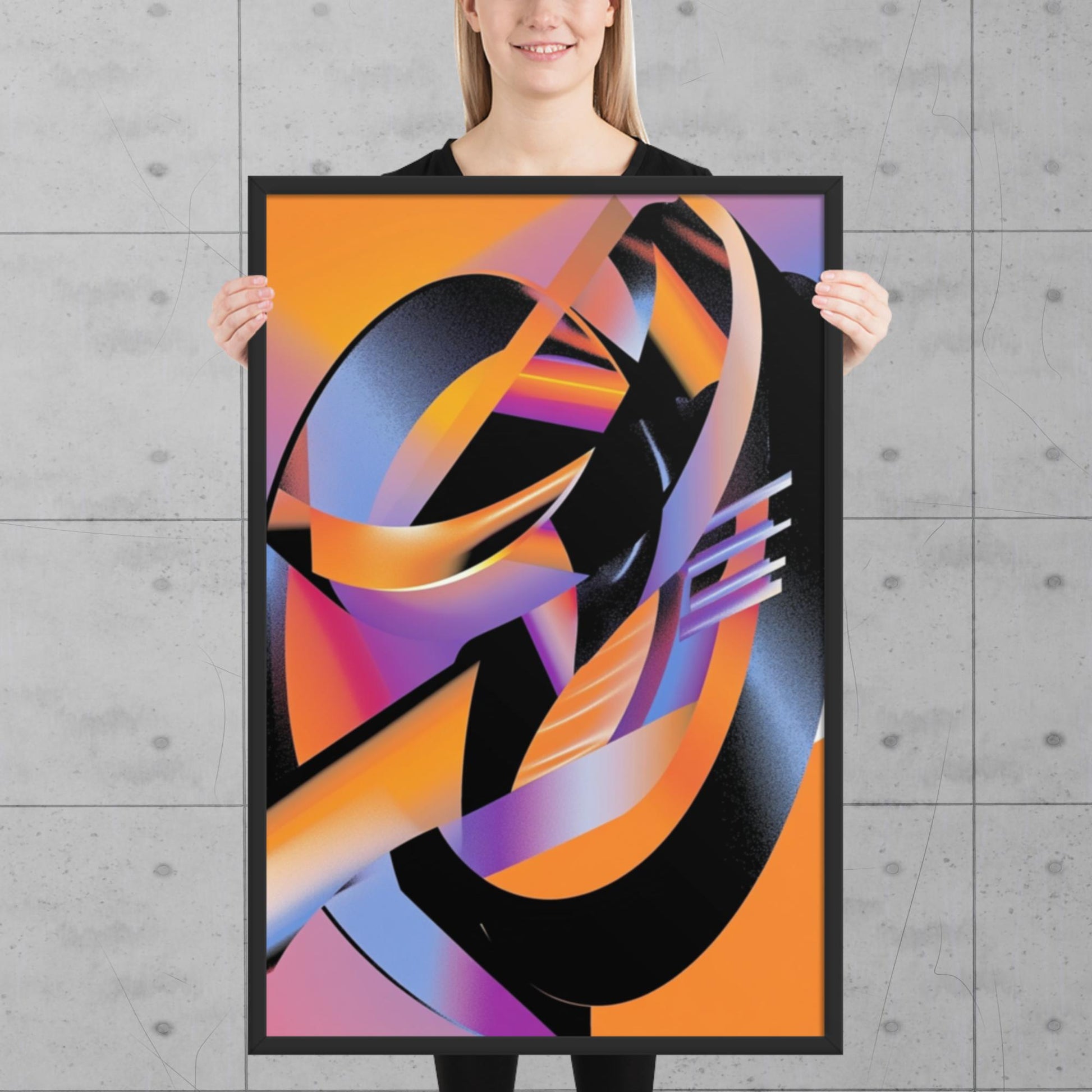 A three-dimensional dance, its volumes accentuated by deep shadows and subtle gradients that transition between vibrant oranges, intense purples, and shimmering pinks. Strategically placed black accents add graphic impact and an illusion of perpetual motion.