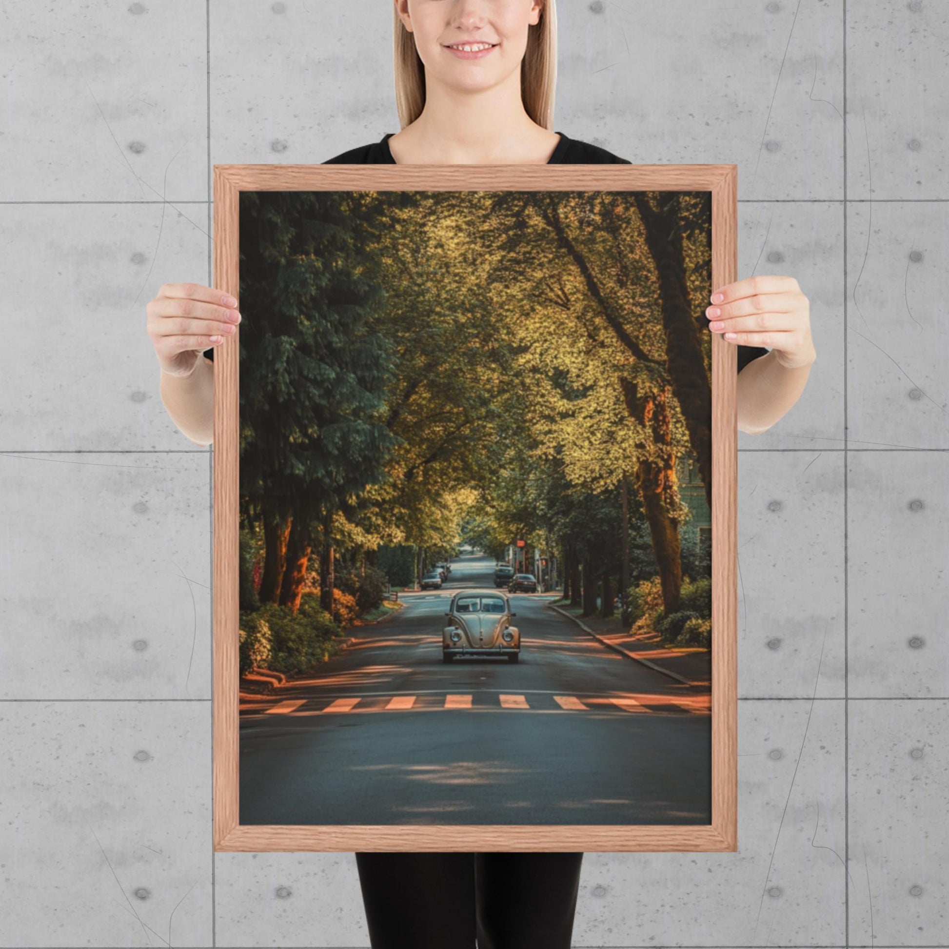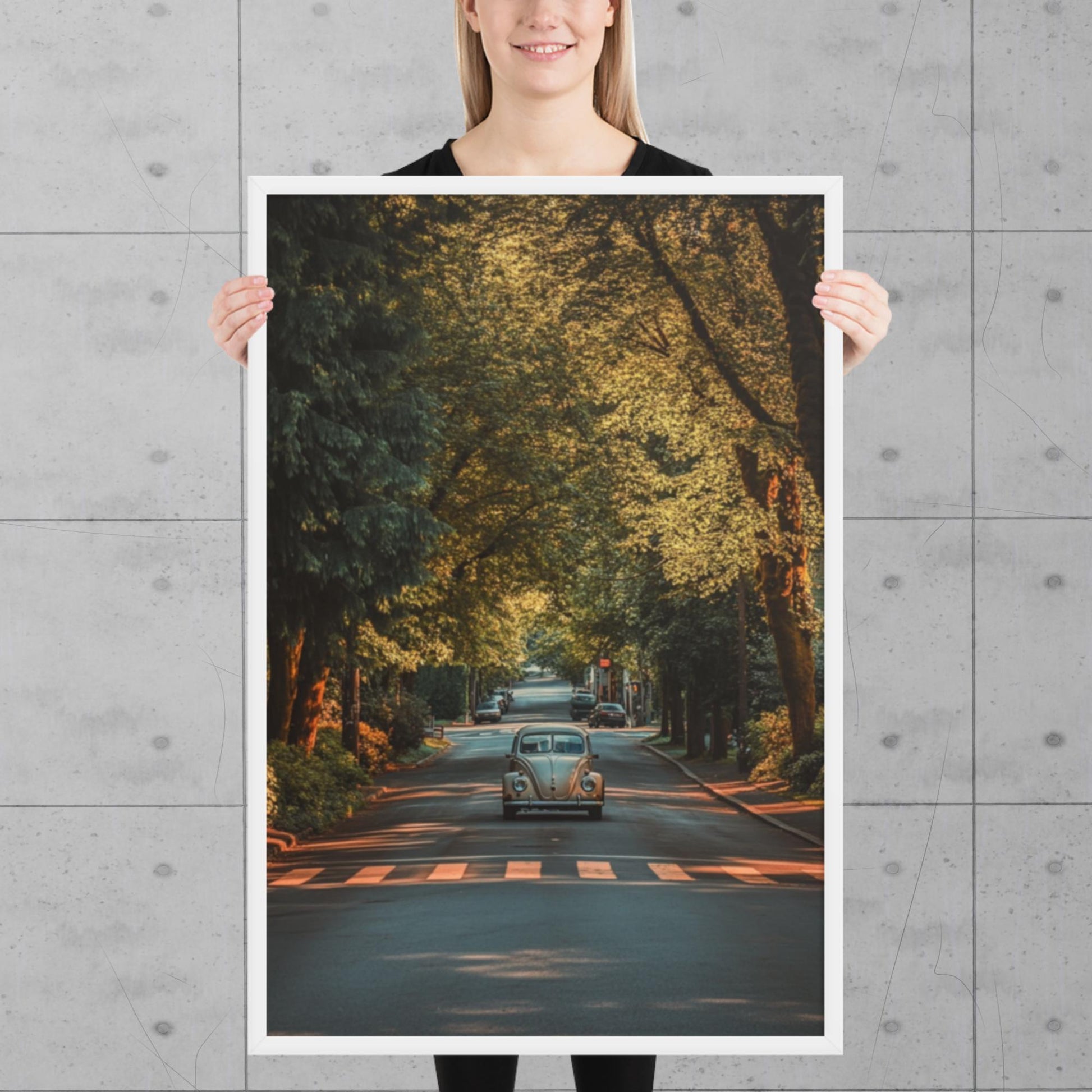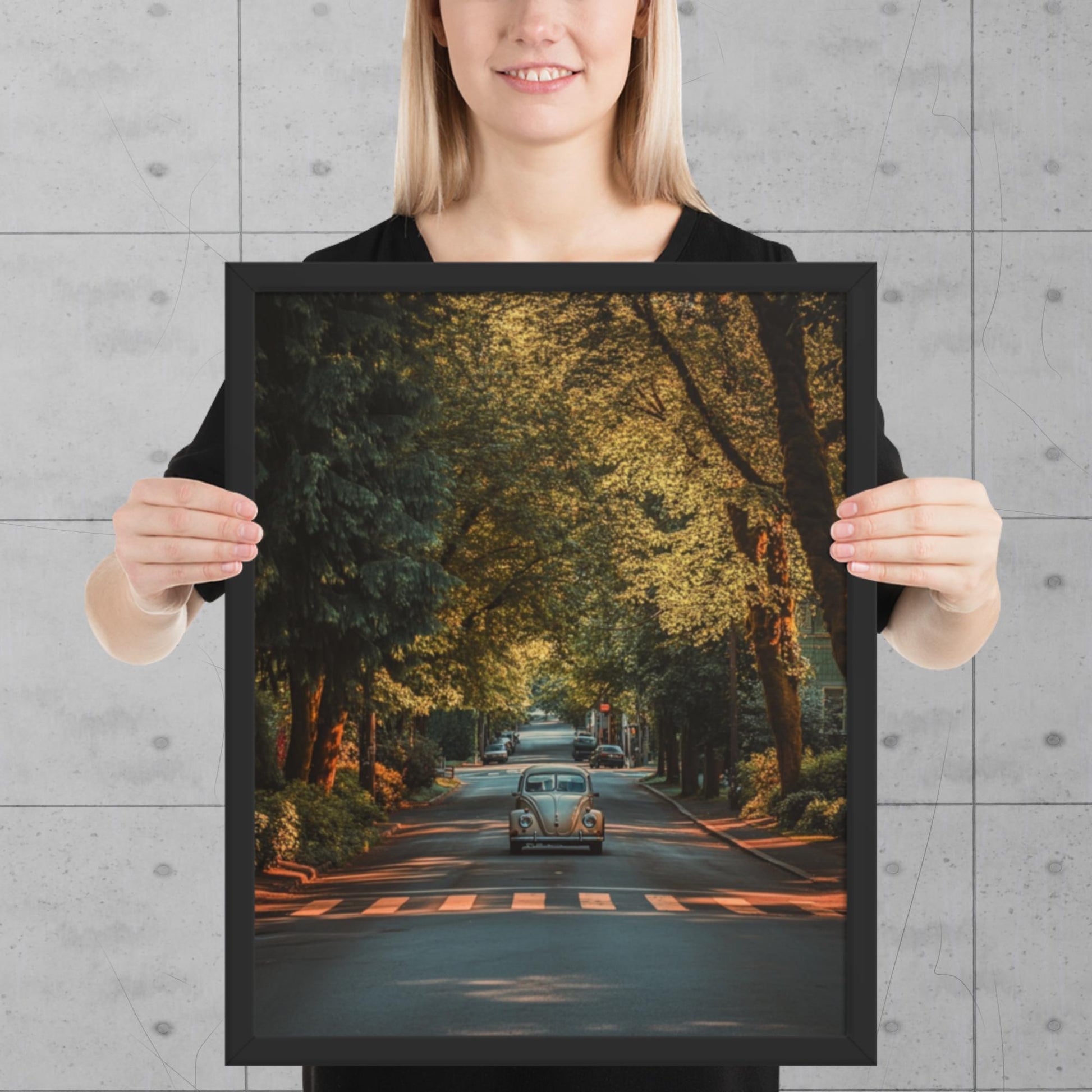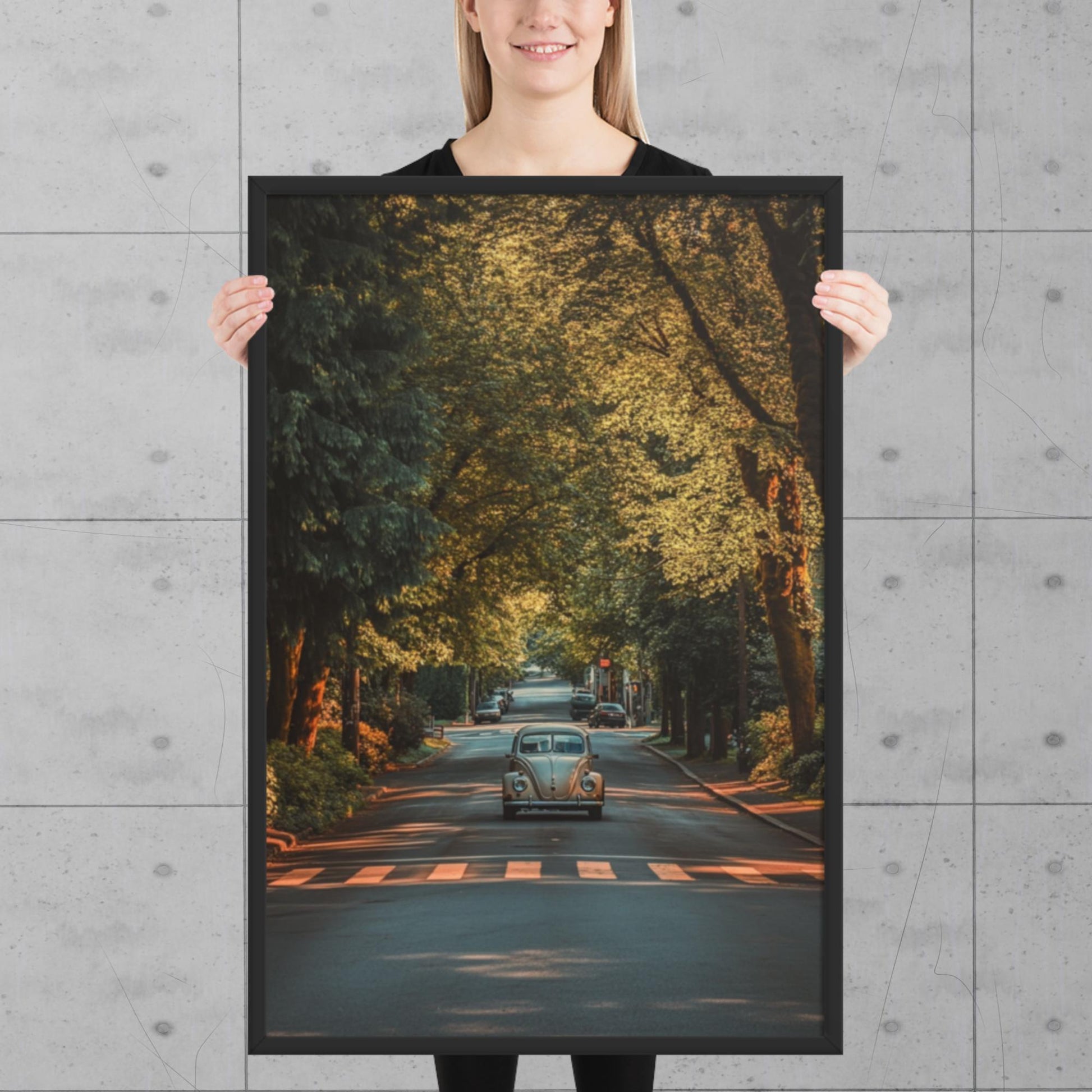 Transport your space to a charming scene that captures the essence of everyday life on a tree-lined street, where an iconic vintage Volkswagen vehicle adds a touch of character and nostalgia. Perfect for those who appreciate beauty in everyday details, inviting the viewer to reminisce and dream. Ideal for spaces looking for a touch of warmth and retro style.