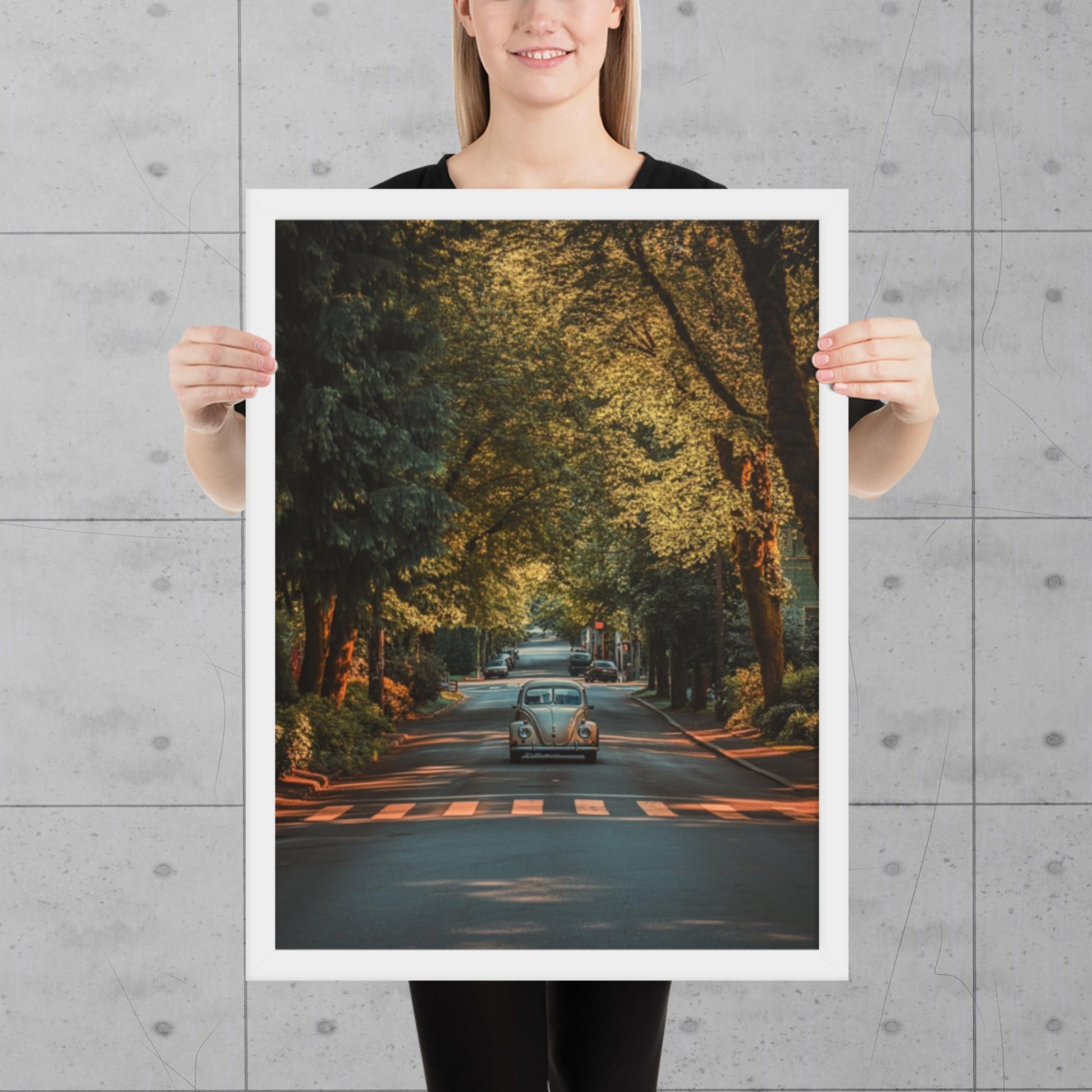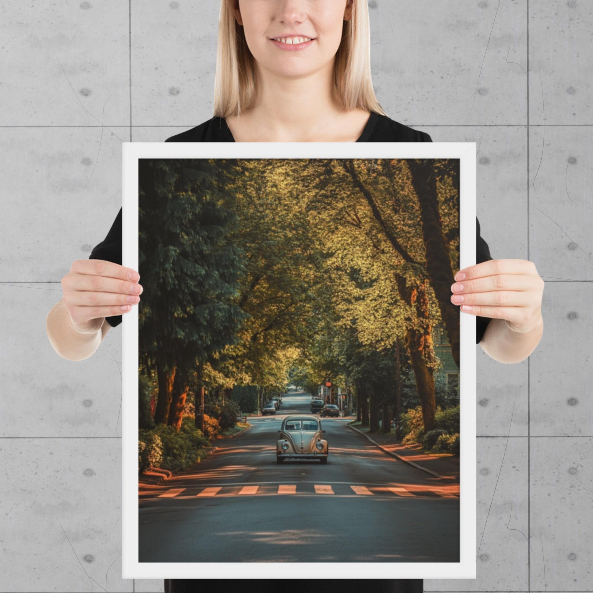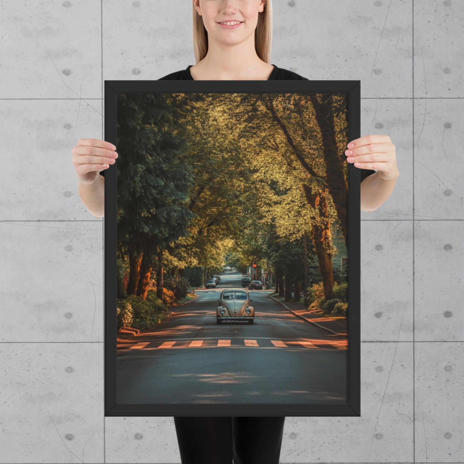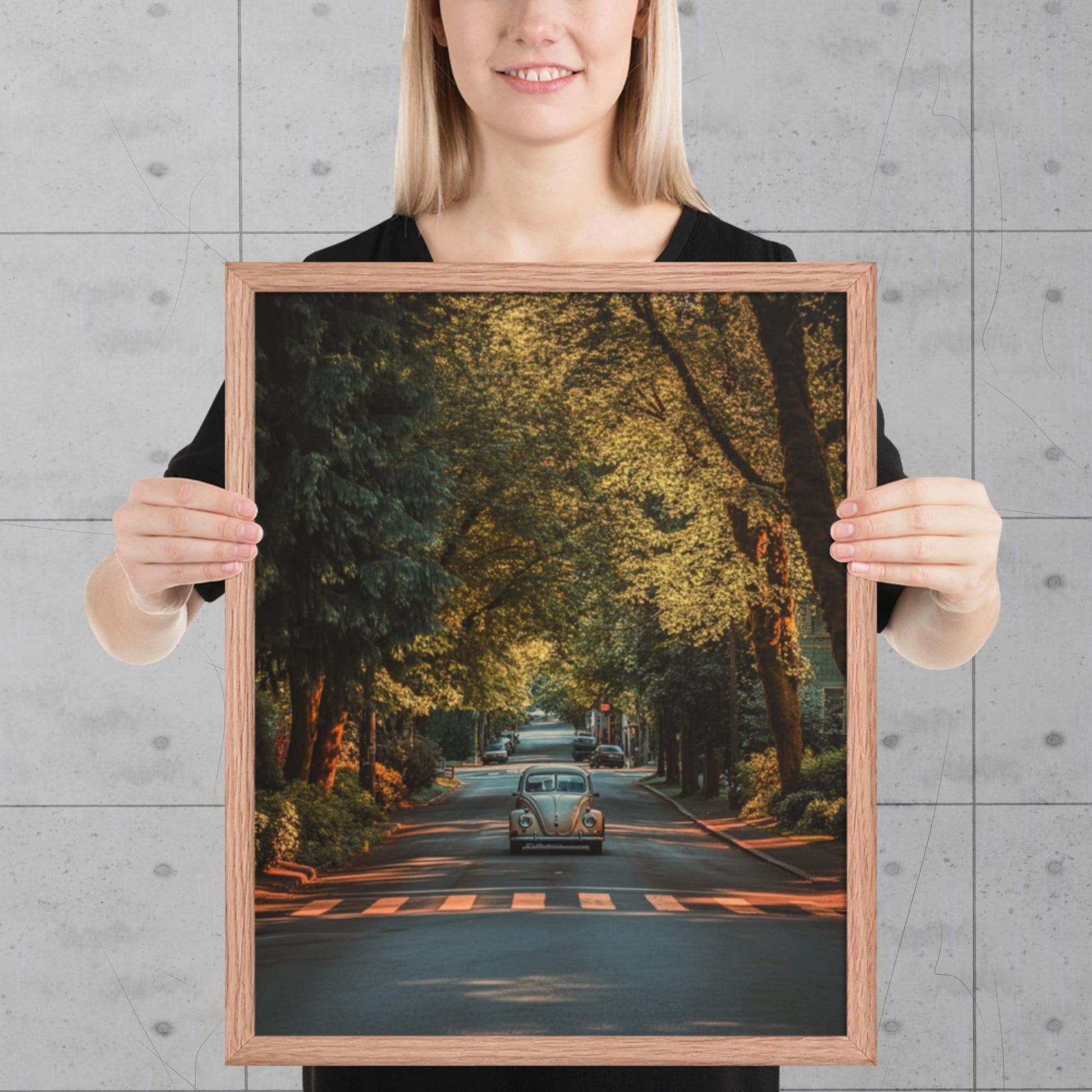 Transport your space to a charming scene that captures the essence of everyday life on a tree-lined street, where an iconic vintage Volkswagen vehicle adds a touch of character and nostalgia. Perfect for those who appreciate beauty in everyday details, inviting the viewer to reminisce and dream. Ideal for spaces looking for a touch of warmth and retro style.